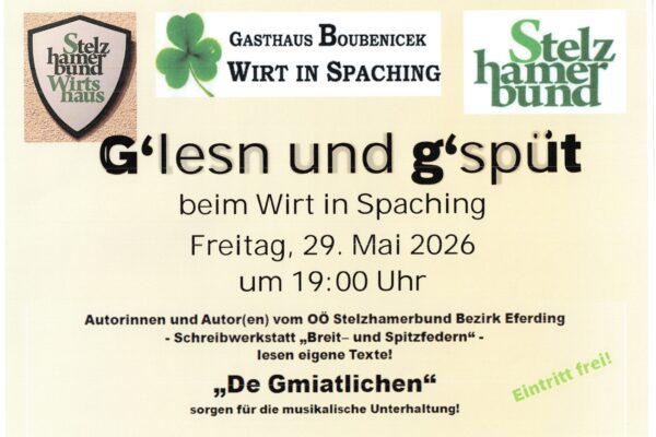 G´lesen und g´spüt – ein Unterhaltungsabend mit Autorinnen und Autoren vom Stelzhamerbund OÖ. Musik: „De Gmiatlichen“ Freitag, 29. Mai 26 – 19:00 Uhr Eintritt Frei